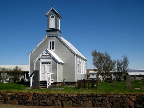 Tradycyjny islandzki kościół torfowy w Hof, który jest jednym z najlepiej zachowanych tego typu obiektów na wyspie. Otoczony zielonymi wzgórzami, wygląda jak z bajki.